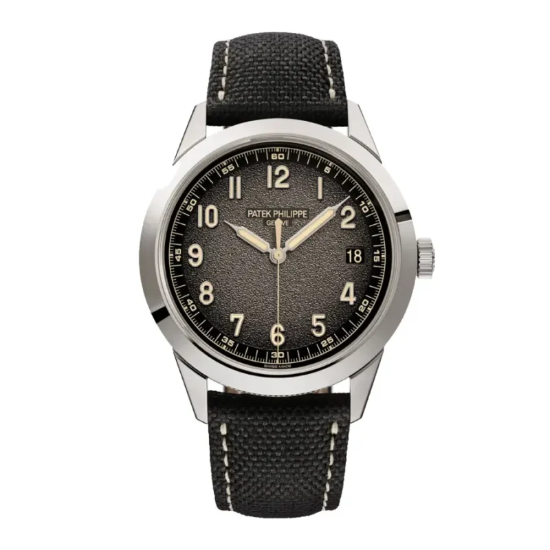 Its textured charcoal dial features a gradient finish with beige luminous numerals and hands, creating a vintage-inspired yet modern aesthetic. The clean layout, combined with subtle detailing, delivers excellent legibility while preserving the understated sophistication of the Calatrava line.